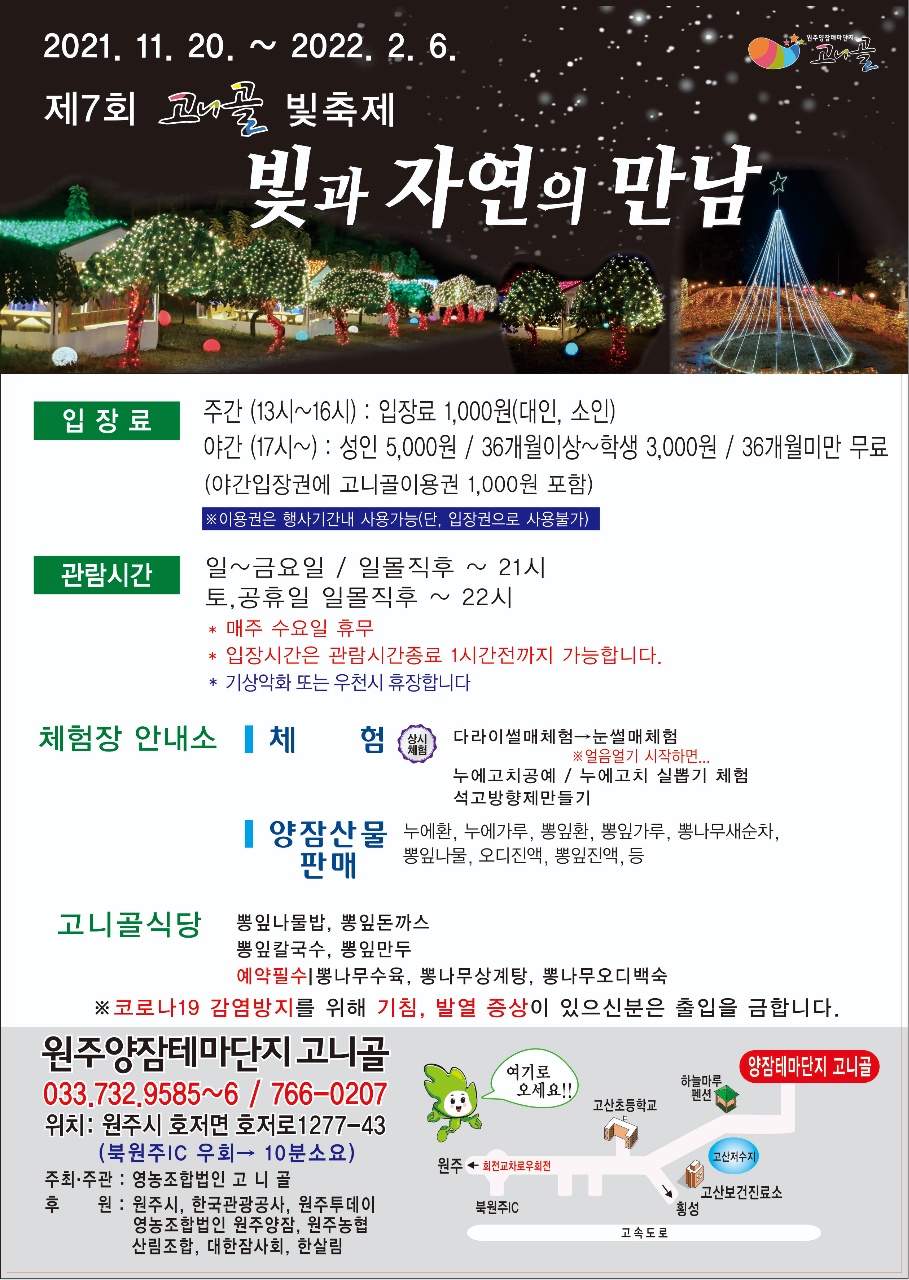 빛과 자연의 만남!! 고니골 빛축제는 양잠 농가의 겨울비수기를 통한 일자리창출과 넓은 농장을 이용 힐링을 주는 보는 즐거움인 빛과 더불어 아이들 겨울 놀거리로 썰매 타기 체험, 누에실 뽑기 체험 외 뽕나무와 뽕잎, 오디를 이용한 먹거리도 즐길 수 있도록 활용하였습니다. 오늘은 고니골 빛축제에 대해 알아보겠습니다.
