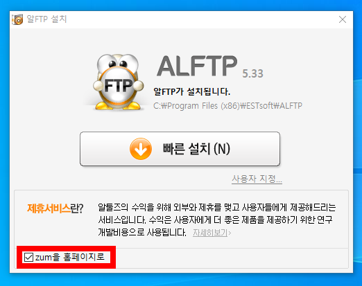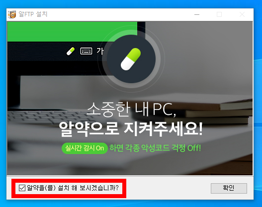 설치가 끝날 때쯤에 아래에 보이는 것처럼 알약을 설치해 보시겠습니까? 박스가 나옵니다. 편하신 데로 하시면 됩니다.