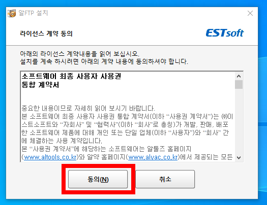 클릭하시고 설치를 시작하시면 아래에 보이는 동의 버튼이 나옵니다. 역시 클릭해 주세요.