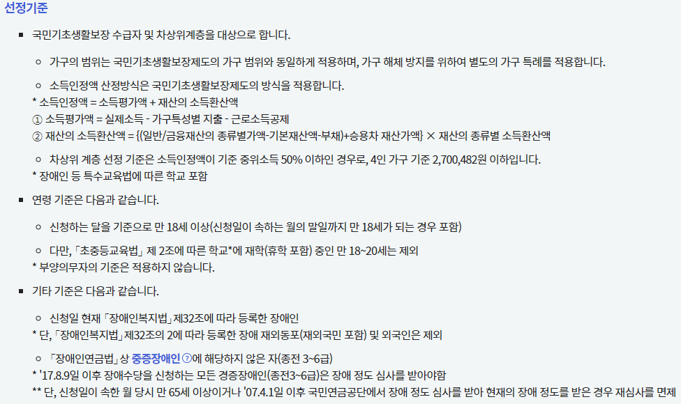 -소득인정액, 연령, 기타 기준은 선정기준의 내용을 참고해 주시기 바랍니다.
