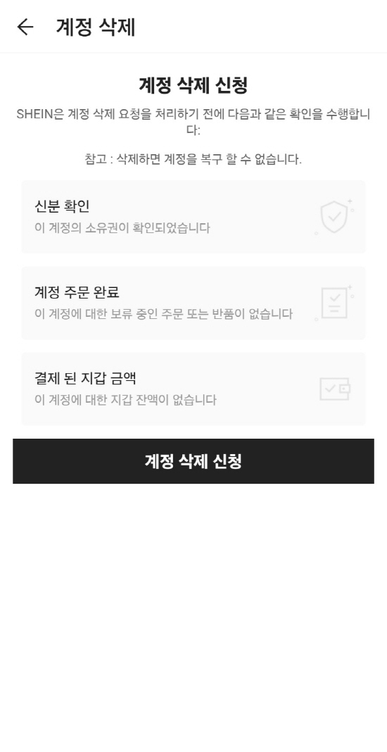 쉬인쇼핑 탈퇴방법도 알아보겠습니다. 우선 왼쪽에 보이는 나를 클릭합니다. 그러면 로그인/등록으로 이동하는데요. 여기서 톱니바퀴를 클릭합니다. 계정삭제버튼을 클릭하면 오른쪽에 계정 삭제 신청을 클릭하시면 됩니다.