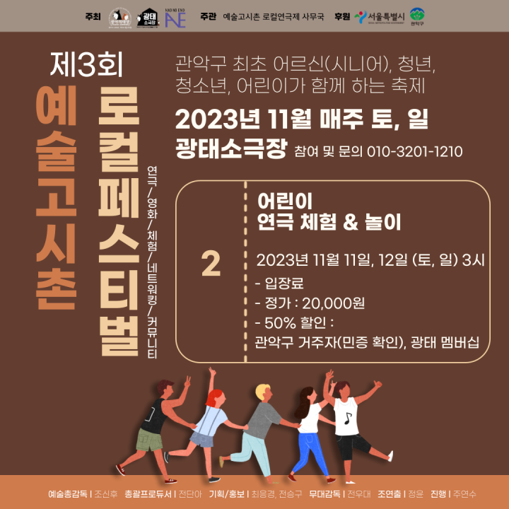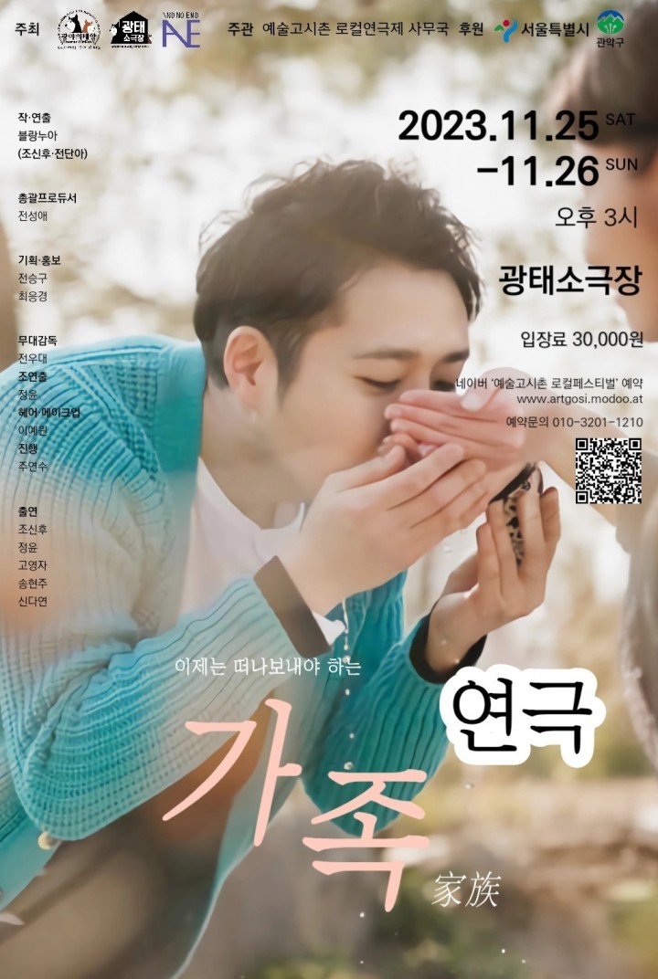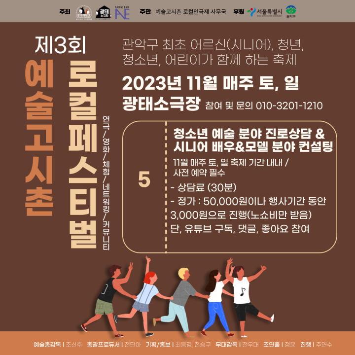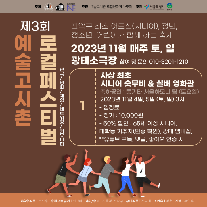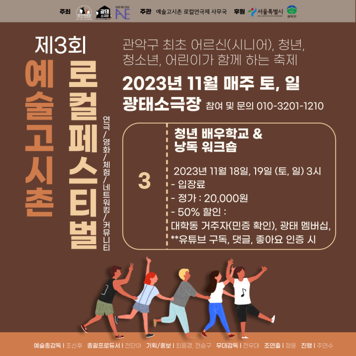 제3회 예술고시촌 로컬페스티벌은 관악구 최초 어르신(시니어), 청년, 청소년, 어린이가 함께하는 축제입니다. 11월 4주간 매주 토요일, 일요일 오후 3시 광태소극장에서 진행된다. 매주 다른 프로그램이 진행되며, 네이버 예약을 통해 프로그램에 참여할 수 있습니다. 11월 셋째 주(18일, 19일)에는 청년 배우학교&낭독 워크숍을 마지막 넷째 주(25일, 26일)에는 연극 '가족' 공연을 진행합니다. 예술고시촌 로컬페스티벌에 대해 알아보겠습니다.